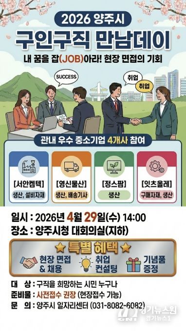 행사는 오는 4월 29일 오후 2시부터 4시까지 양주시청 대회의실에서 진행되며, 구직자는 사전 신청 또는 행사 당일 오후 1시 30분부터 현장 접수 후 면접에 참여할 수 있다. 참여를 희망하는 구직자는 이력서 등 지원 서류를 지참해야 한다.