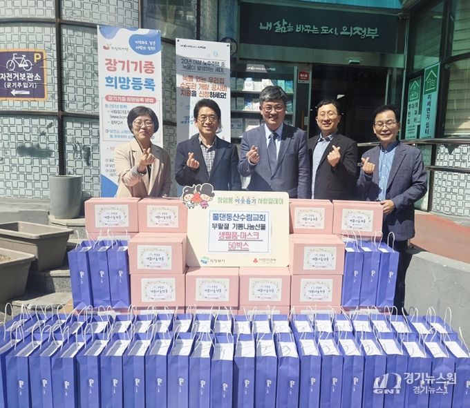 [경기뉴스원/경기뉴스1] | 의정부시 장암동주민센터는 4월 16일 물댄동산수림교회가 부활절을 맞아 지역 내 어려운 이웃을 위해 ‘기쁨나눔선물 세트’와 마스크 50상자를 기탁했다고 밝혔다.