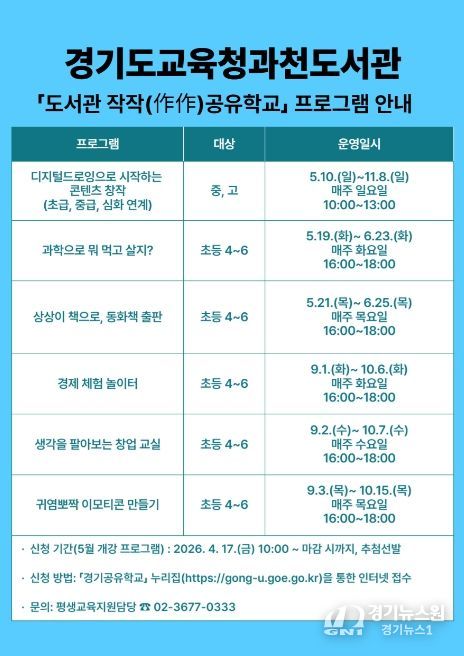 [경기뉴스원/경기뉴스1] | 경기도교육청과천도서관이 학생들의 자기주도 학습 역량과 창의적 사고력 함양을 위해 ‘도서관 작작(作作) 공유학교’를 운영한다.