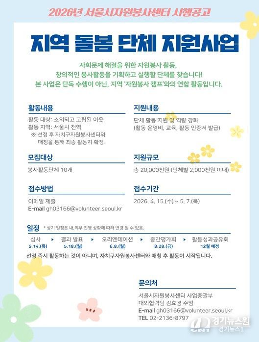 [경기뉴스원/경기뉴스1] | 서울시자원봉사센터는 복지 사각지대 주민의 외로움 해소를 위해 자치구자원봉사센터(자원봉사 캠프)와 협력하여 신규 봉사활동을 기획하고 운영할 비영리 단체를 모집한다고 밝혔다.