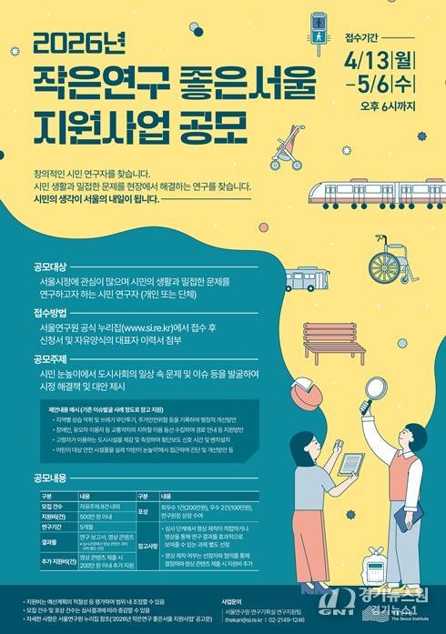 [경기뉴스원/경기뉴스1] | 서울연구원은 4월 13일~5월 6일까지 '2026년 작은연구 좋은서울 지원사업' 공모를 진행한다고 밝혔다.