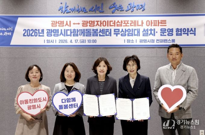 시는 17일 오전 시청 컨퍼런스룸에서 광명제1R구역 주택재개발정비사업조합(조합장 박효영)과 ‘광명자이더샵포레나 다함께돌봄센터 설치 및 운영을 위한 무상임대 협약’을 체결했다.