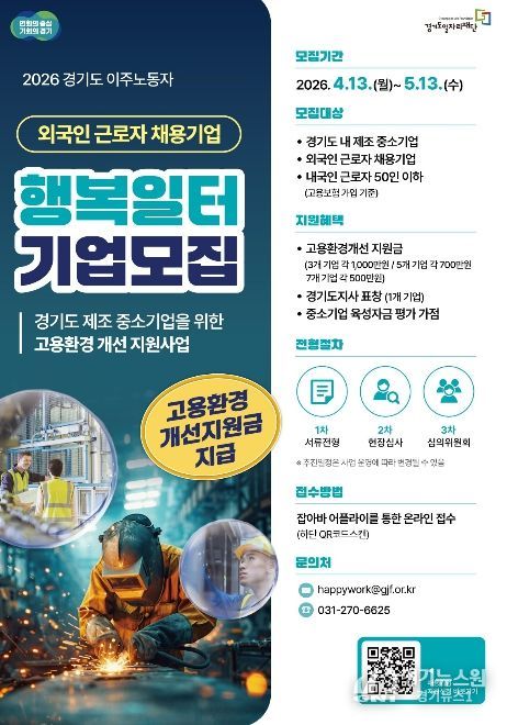 [경기뉴스원/경기뉴스1] | 경기도와 경기도일자리재단은 도내 외국인 근로자를 고용한 중소 제조기업을 대상으로 ‘2026년 경기도 이주노동자 행복일터 선정사업’ 참여기업을 모집한다고 20일 밝혔다.