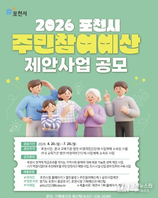 [경기뉴스원/경기뉴스1] | 포천시가 4월 20일부터 오는 7월 20일까지 2027년도 예산편성을 위한 주민참여예산 공모제안사업을 접수하고 있다.