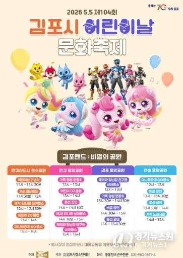 [경기뉴스원/경기뉴스1] | 오는 5월 5일, 김포 전역이 하나의 거대한 놀이공원이 된다. 김포시는 시가 주최하고 김포시청소년재단에서 주관하는 제104회 어린이날 문화축제가 한강신도시호수공원(마산동), 한강중앙공원(장기동), 걸포중앙공원(걸포동), 마송중앙공원(통진읍)에서 동시 개최된다고 20일 밝혔다.