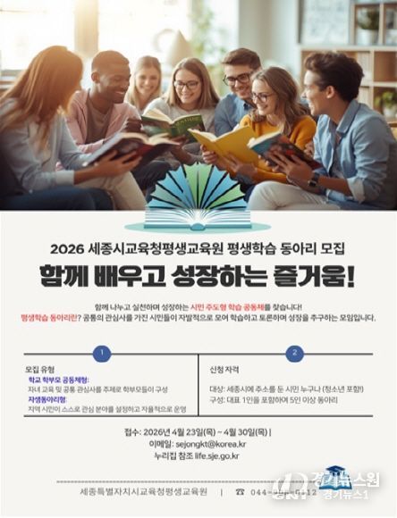 [경기뉴스원/경기뉴스1] | 세종특별자치시교육청평생교육원은 시민의 자율적 학습 역량 강화와 지역 학습 공동체 활성화를 위해 ‘2026 평생학습 동아리’에 참여할 공동체를 4월 23일부터 30일까지 공개 모집한다.