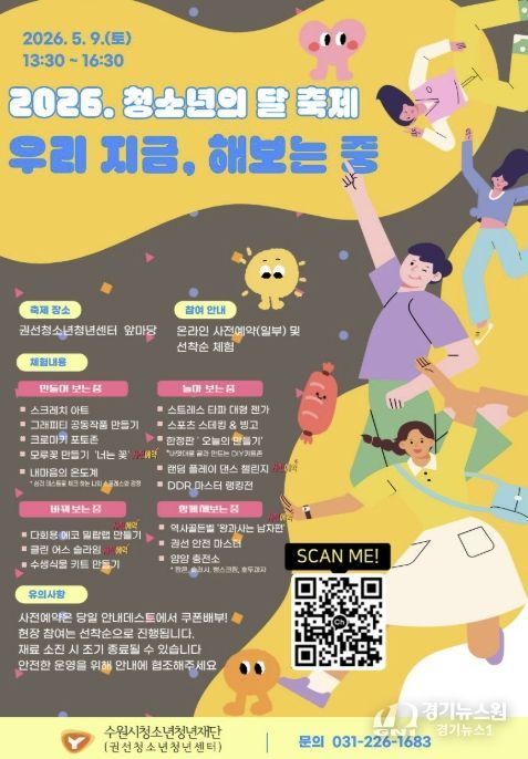 [경기뉴스원/경기뉴스1] | 수원시청소년청년재단 권선청소년청년센터가 오는 5월 9일, 청소년이 주인공이 되어 직접 경험하고 도전하는 참여형 축제 ‘지금우리, 해보는중’을 개최한다고 밝혔다.