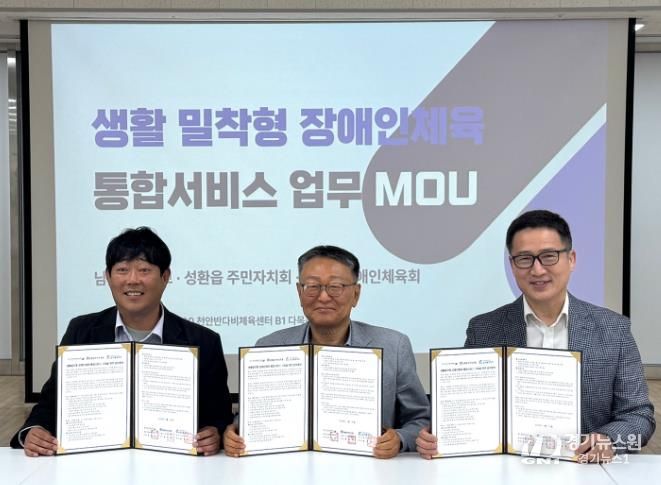 [경기뉴스원/경기뉴스1] | 천안시장애인체육회는 22일 천안반다비체육센터에서 성환읍 주민자치회, 남서울대학교와 ‘생활밀착형 장애인체육 통합서비스 구축을 위한 업무협약’을 체결했다.
