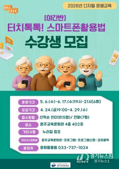 [경기뉴스원/경기뉴스1] | 원주교육문화관은 낮 시간 교육 참여가 어려운 성인들을 위해 오는 5월 6일부터 6월 17일까지 ‘야간반 터치톡톡! 스마트폰활용법’을 운영한다.