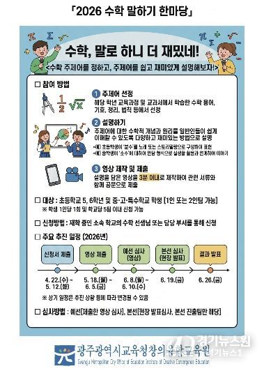 [경기뉴스원/경기뉴스1] | 광주시교육청창의융합교육원은 학생이 주도적으로 수학적 개념을 이해하고 설명하는 '2026 수학 말하기 한마당'을 운영한다.