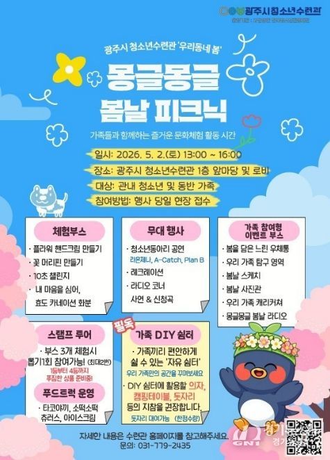 [경기뉴스원/경기뉴스1] | 광주시 청소년수련관은 오는 5월 2일 오후 1시부터 수련관 1층 앞마당 및 로비에서 ‘2026년 우리동네 봄 몽글몽글 봄날 소풍’을 개최한다고 23일 밝혔다.