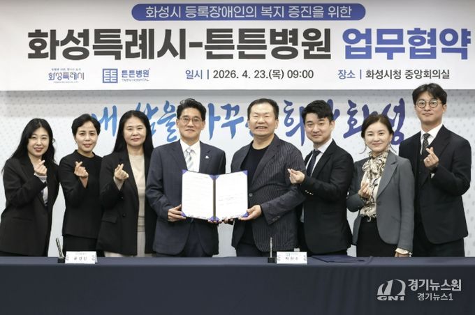 [경기뉴스원/경기뉴스1] | 화성특례시는 23일 본관 2층 중앙회의실에서 튼튼병원과 화성시 등록장애인의 건강한 생활 지원과 삶의 질 향상을 위한 업무협약을 체결했다.