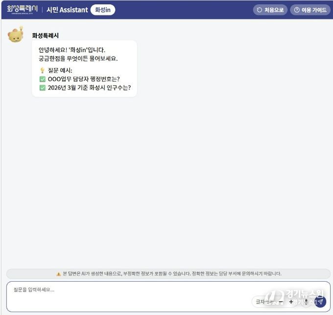[경기뉴스원/경기뉴스1] | 화성특례시는 시민 체감형 행정서비스 강화를 위해 23일부터 ChatGPT 기반 대화형 AI 검색 서비스 ‘화성in’을 정식 운영한다.