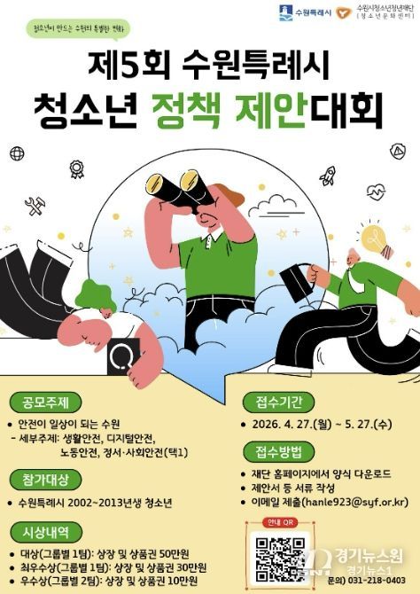 [경기뉴스원/경기뉴스1] | 수원시청소년청년재단 수원청소년문화센터는 청소년이 정책을 기획하고 제안하는 ‘제5회 수원특례시 청소년 정책 제안대회’ 참가팀을 4월 27일부터 5월 27일까지 모집한다.