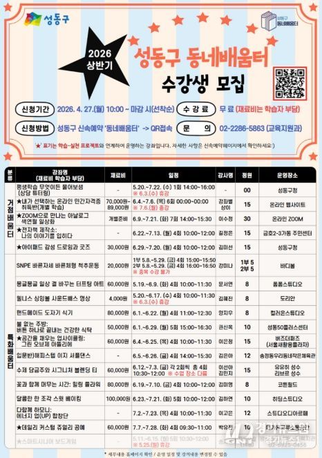 [경기뉴스원/경기뉴스1] | 서울 성동구가 올해 약 3,800만 원의 예산을 투입해 주민 주도형 평생학습 생태계를 조성하는 ‘2026년 성동구 동네배움터’ 운영에 본격적으로 나선다고 밝혔다.
