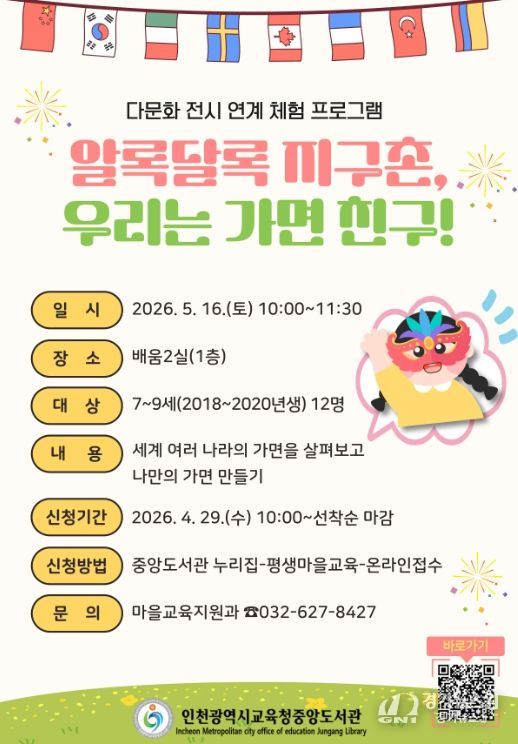 [경기뉴스원/경기뉴스1] | 인천광역시교육청중앙도서관은 5월 16일 다문화 전시 연계 체험 ‘알록달록 지구촌, 우리는 가면 친구!’를 운영한다.