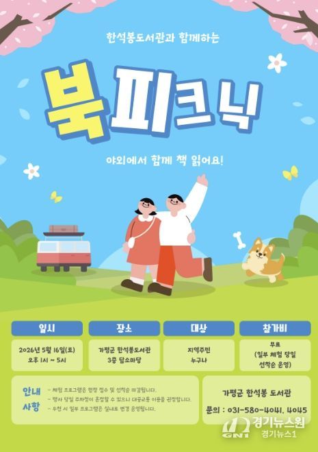 [경기뉴스원/경기뉴스1] | 가평군은 5월 가정의 달을 맞아 오는 16일 한석봉도서관 3층 담소마당에서 ‘가족과 함께하는 북 피크닉’ 행사를 개최한다고 밝혔다.
