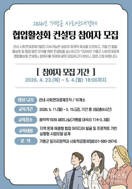 [경기뉴스원/경기뉴스1] | 가평군이 사회연대경제 조직 간 협업 활성화를 위해 ‘2026년 사회연대경제 협업활성화 컨설팅’을 추진하고, 참여 조직을 5월 4일까지 모집한다.
