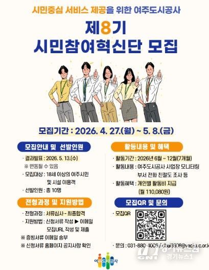 [경기뉴스원/경기뉴스1] | 여주도시공사는 여주시민 및 이용 고객들의 다양한 의견을 수렴하고, 함께 문제를 해결하는 시민참여형 활동의 일환인 ‘시민참여혁신단 8기’를 모집한다고 밝혔다.