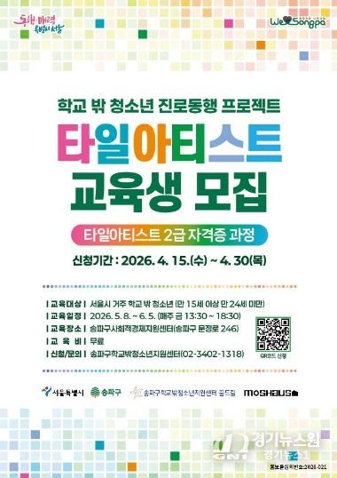 [경기뉴스원/경기뉴스1] | 송파구는 서울시 ‘약자와의 동행’ 공모사업으로 학교 밖 청소년들의 사회진입과 자립을 돕기 위한 ‘타일아티스트 교육’을 실시한다고 24일 밝혔다.