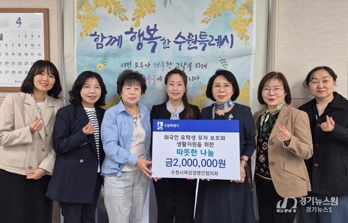 [경기뉴스원/경기뉴스1] | 수원시 여성경영인협의회는 “한국으로 유학 온 뒤 미혼모로 출산한 외국인 유학생과 신생아의 안정적인 생활을 돕는 데 사용해 달라”며 24일 수원시에 200만 원을 전달했다.