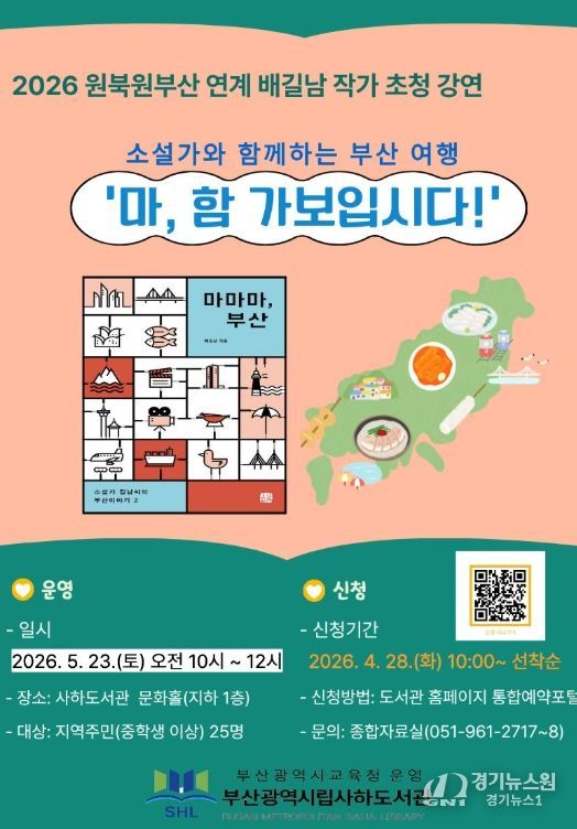 [경기뉴스원/경기뉴스1] | 부산광역시립사하도서관은 다음달 23일 오전 10시 사하도서관 문화홀에서 청소년과 성인 25명을 대상으로 2026 원북원부산 연계 배길남 작가 초청 강연 ‘마, 함 가보입시다!’를 개최한다.