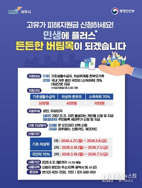 [경기뉴스원/경기뉴스1] | 파주시는 오늘(27일)부터 시민 생활 안정을 위한 정부 추진 ‘고유가 피해지원금’1차 신청을 받는다. 이번 1차 신청 대상은 기초생활수급자, 차상위계층, 한부모가구이며, 신청 기간은 4월 27일부터 5월 8일까지다.