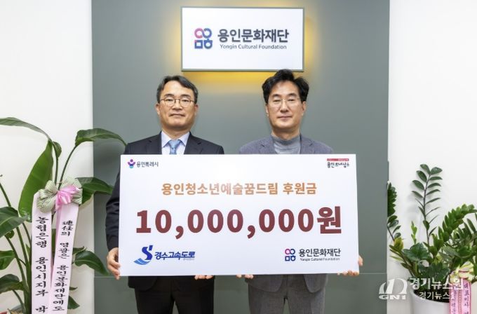 [경기뉴스원/경기뉴스1] | 용인문화재단은 지난 23일 경수고속도로(주)로부터 용인시 관내 청소년 예술 장학사업인 ‘용인청소년예술꿈드림’ 지원을 위한 기부금 1,000만 원을 기탁받았다고 밝혔다. 이번 후원은 용인서울고속도로를 이용하는 통행차량 1대당 1원씩 적립하고, 사회공헌예산을 추가로 편성해 지역사회 환원과 기업의 사회적 책임 실천 차원에서 추진됐다.