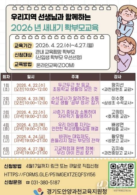 [경기뉴스원/경기뉴스1] | 경기도안양과천교육지원청은 오는 4월 22부터 27일까지 관내 신입생 학부모를 대상으로 ‘우리지역 선생님과 함께하는 2026년 새내기 학부모 교육’을 개최한다.