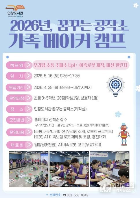 [경기뉴스원/경기뉴스1] | 구리시 인창도서관‘꿈꾸는 공작소’는 오는 5월 16일 초등학생 자녀와 보호자가 함께 참여해 가족 간 유대감을 높이고 인공지능을 체험하는 '우리 팀 소통 주파수 Up! : 이족로봇 제작, 미션 챌린지' 가족 메이커 캠프를 운영한다고 밝혔다.