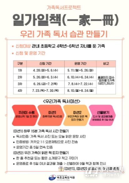 [경기뉴스원/경기뉴스1] | 속초교육도서관은 2026년 5월부터 8월까지 가족이 함께 책을 읽고 소통하는 독서문화 확산을 위해 가족 독서 프로젝트 ‘일가일책(一家一冊)’을 운영한다.