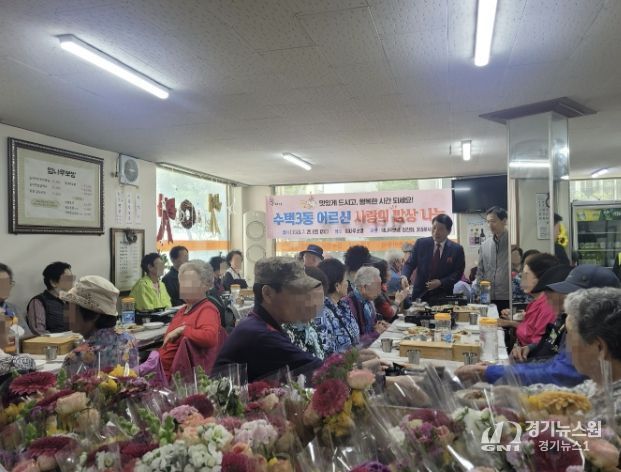 이번 행사는 엄나무보쌈에서 정성껏 준비한 음식으로 어르신들에게 따뜻한 한 끼를 대접하고, 365꽃시장(대표 안지현)과 친목 모임 엄친회가 후원 물품을 전달하며 나눔에 동참해 더욱 뜻깊게 진행됐다. 또한 수택3동지역사회보장협의체 위원들도 행사에 참석해 배식 봉사에 참여하며 어르신들을 위문했다.