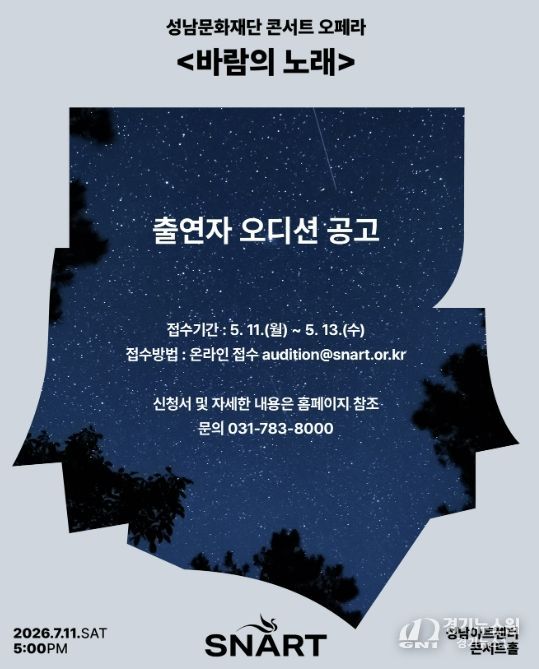 [경기뉴스원/경기뉴스1] | 성남문화재단은 콘서트 오페라 ‘바람의 노래’ 무대를 빛낼 주역 성악가를 선발하는 오디션을 개최한다.
