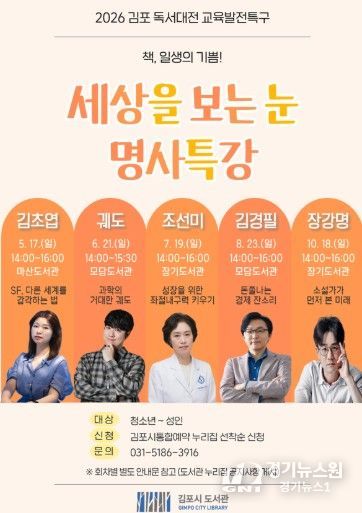 [경기뉴스원/경기뉴스1] | 김포시 도서관은 2026 김포 독서대전 교육발전특구 사업으로 '세상을 보는 눈, 명사특강'을 오는 5월 17일부터 10월 18일까지 5회에 걸쳐 관내 도서관 3곳에서 진행한다.