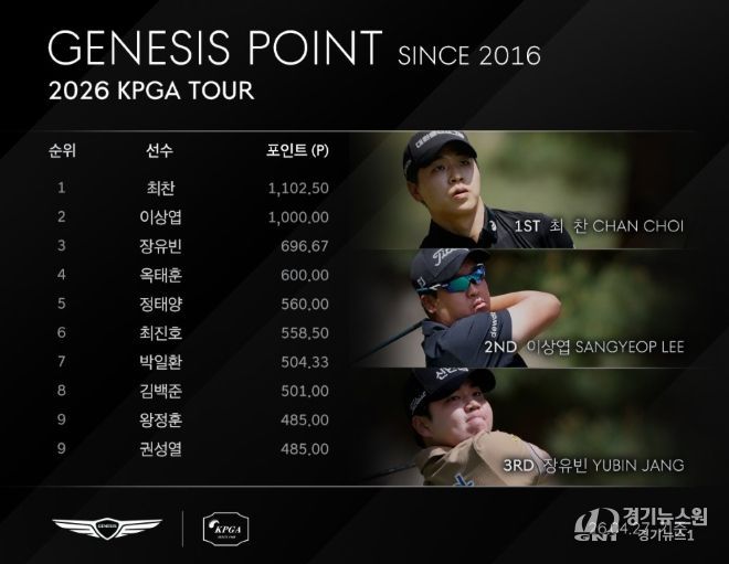 [경기뉴스원/경기뉴스1] | 최찬(29.(주)대원플러스그룹)이 ‘2026 우리금융챔피언십’에서 KPGA 투어 첫 우승과 함께 제네시스 포인트 최상단에 이름을 올렸다. ‘KPGA 투어 QT’를 통해 2022년 KPGA 투어에 데뷔하고 32번째 대회 출전 만에 이룬 우승이다.