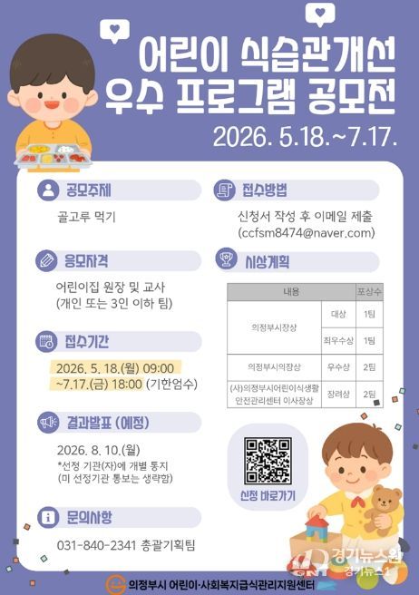 [경기뉴스원/경기뉴스1] | 의정부시가 운영하는 의정부시 어린이‧사회복지급식관리지원센터는 어린이 보육시설을 대상으로 5월 18일부터 7월 17일까지 ‘어린이 식습관 개선 우수 프로그램 공모전’을 개최한다.