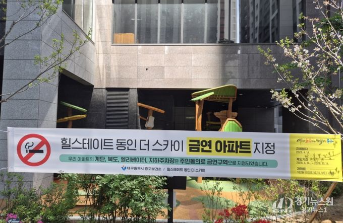 [경기뉴스원/경기뉴스1] | 대구 중구는 공동생활공간에서 발생하는 간접흡연 피해로부터 주민을 보호하고 쾌적한 금연 환경을 조성하기 위해 ‘힐스테이트 달성공원역’(중구 태평로 41)과 ‘힐스테이트 동인 더 스카이’(중구 태평로 240)를 각각 제26호, 제27호 공동주택 금연구역으로 지정했다.