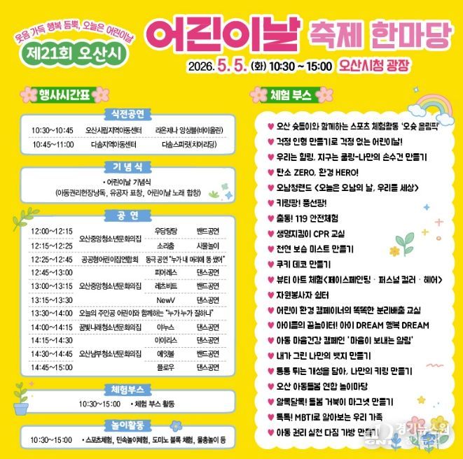 [경기뉴스원/경기뉴스1] | 오산시는 오는 5월 5일 어린이날을 맞아 오산시청 광장에서 ‘제21회 오산시 어린이날 축제 한마당’을 개최한다고 밝혔다.