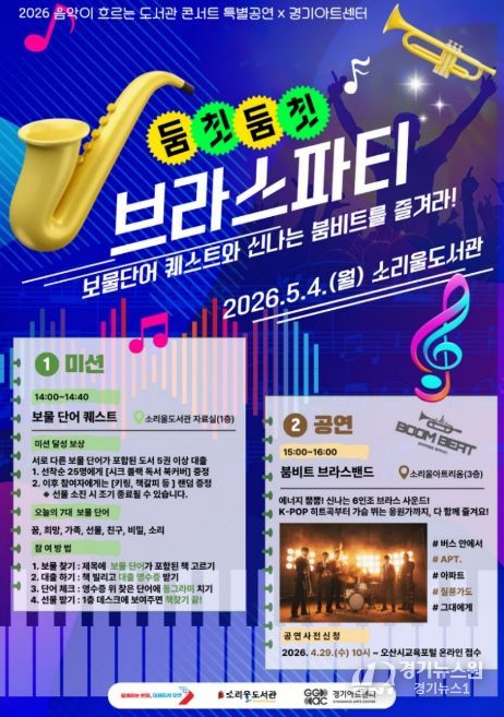 [경기뉴스원/경기뉴스1] | 오산시 소리울도서관은 제104회 어린이날을 앞둔 오는 5월 4일 경기아트센터와 협업해 ‘2026 음악이 흐르는 도서관 콘서트’ 특별공연인 ‘둠칫둠칫 브라스 파티’를 개최한다고 밝혔다.