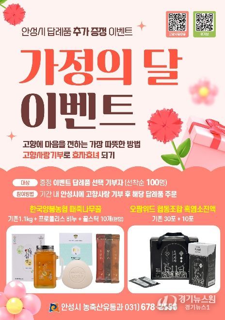 [경기뉴스원/경기뉴스1] | 안성시는 오이데이와 5월 가정의 달을 맞아 고향사랑기부제 참여 확대와 지역 농산물 소비 촉진을 위해 ‘오이데이 이벤트’와 ‘가정의 달 이벤트’를 추진한다고 밝혔다.
