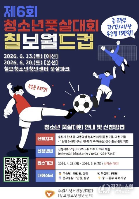[경기뉴스원/경기뉴스1] | 수원시청소년청년재단 칠보청소년청년센터는 오는 6월 13일(예선)과 20일(본선), 양일간 센터 내 풋살파크에서 녪. 청소년 풋살대회 [제6회 칠보월드컵]’을 개최한다고 밝혔다.