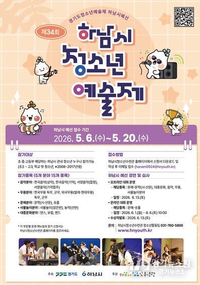 [경기뉴스원/경기뉴스1] | 하남시가 주최하고 하남시청소년수련관이 주관하는 ‘2026 제34회 하남시청소년예술제’가 오는 6월 13일 하남시청소년수련관에서 개최된다.