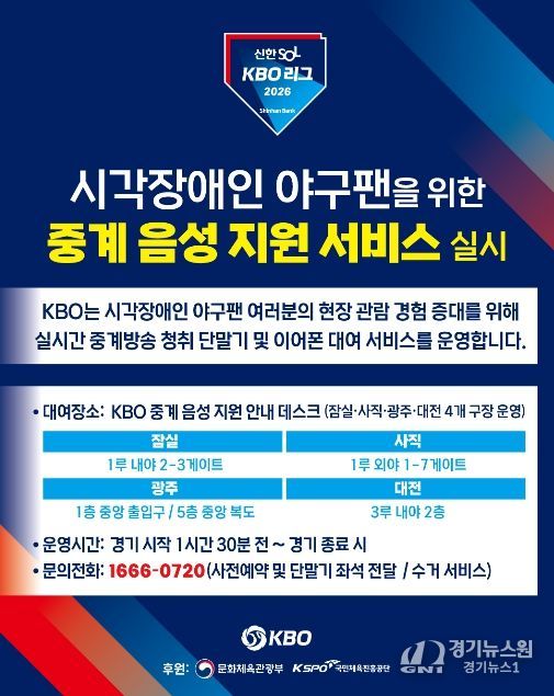 [경기뉴스원/경기뉴스1] | KBO는 2023년부터 잠실, 사직, 광주 구장에서 운영해 온 ‘KBO 리그 시각장애인 현장 관람객 대상 중계 음성 지원 서비스’를 올해 대전 한화생명 볼파크까지 확대해 총 4개 구장에서 운영한다.