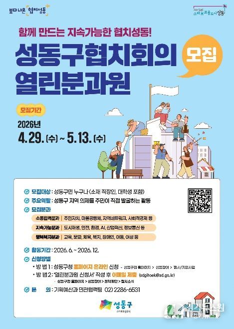 [경기뉴스원/경기뉴스1] | 서울 성동구는 지역사회 주요 현안 해결과 민관 협치 활성화를 위해 '2026년 성동구 협치회의 열린분과원'을 4월 29일부터 5월 13일까지 15일간 모집한다고 밝혔다.