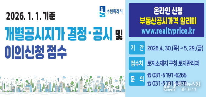 [경기뉴스원/경기뉴스1] | 수원시 권선구는 4월 30일 결정·공시되는 개별공시지가에 대해 4월 30일부터 5월 29일까지 이의신청을 접수한다고 밝혔다.