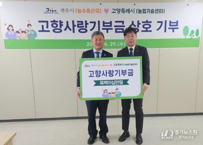 [경기뉴스원/경기뉴스1] | 제주시는 4월 29일 고양특례시 농업기술센터에서 고양특례시와 고향사랑기부금 상호 전달식을 갖고 지역 간 상생과 협력 강화에 뜻을 모았다.