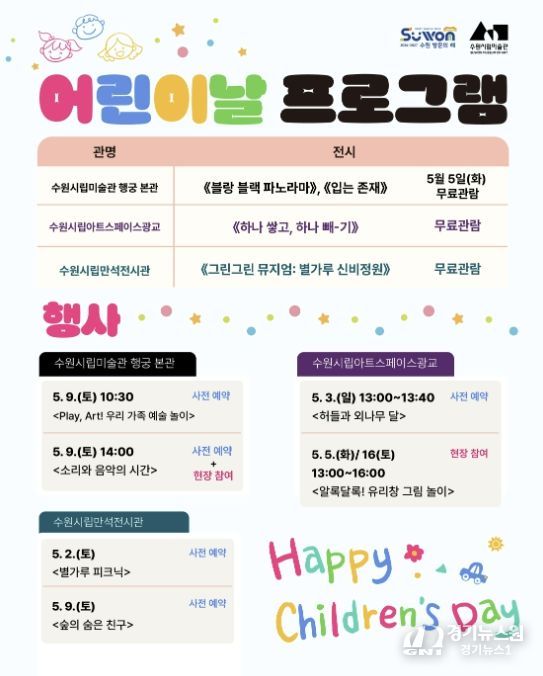 [경기뉴스원/경기뉴스1] | 경기도 수원시립미술관은 2026년 어린이날을 맞아 수원시립미술관 행궁 본관, 수원시립아트스페이스광교, 수원시립만석전시관에서 즐거운 하루를 보낼 수 있는 전시와 다양한 프로그램을 운영한다.