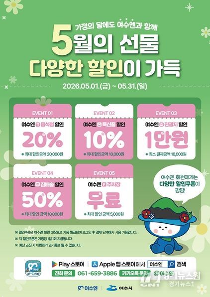 ‘2026 가정의 달 맞이 여수엔 프로모션’은 5월 1일부터 31일까지 한 달간 진행되며, 여수엔 회원을 대상으로 다양한 할인 혜택과 참여형 이벤트를 제공한다.