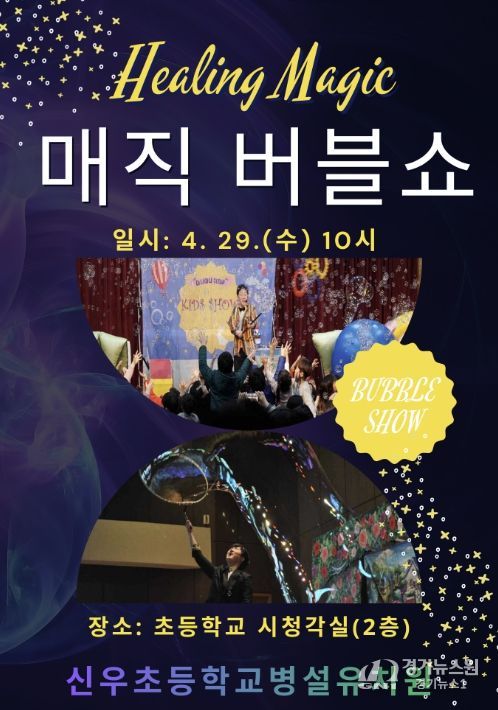 [경기뉴스원/경기뉴스1] | 신우초등학교병설유치원은 4월 29일 교내 시청각실에서 ‘힐링 매직버블쇼’ 공연을 개최했다고 밝혔다. 이번 공연은 유아들이 직접 참여하며 즐길 수 있는 체험형 프로그램으로 마련됐다.