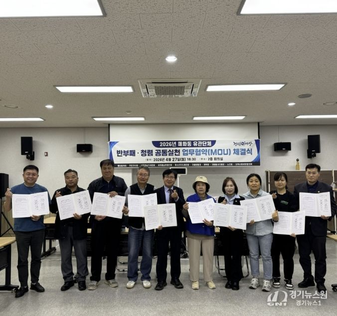 [경기뉴스원/경기뉴스1] | 시흥시 매화동 행정복지센터는 지난 4월 27일 청렴 가치 실천과 청렴 문화 확산을 위해 관계단체와 함께 ‘반부패·청렴 공동실천 업무협약’을 체결했다.